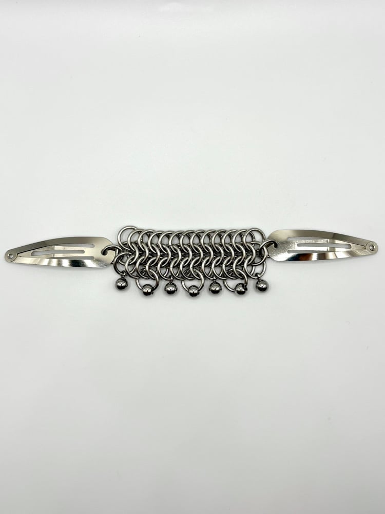 Accessorize your hairstyle with a Bramble Barette. Made with 2 inch metal hair clips, stainless steel charms and chainmail.